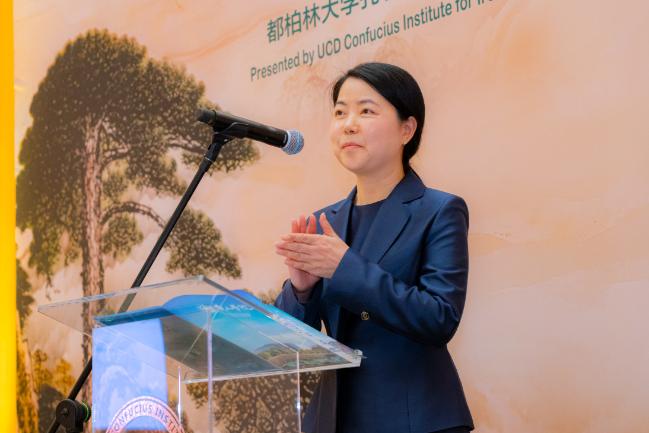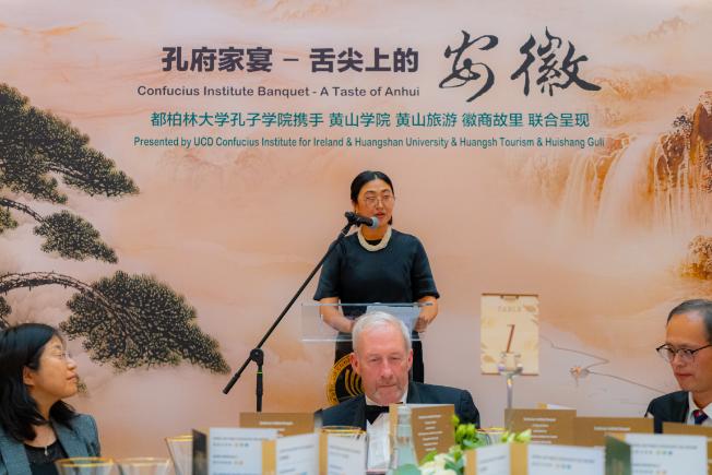 都柏林大学孔子学院院长王艳玲女士随后致辞,代表主办方向都柏林大学以及长期以来支持学院发展的合作伙伴和嘉宾们表示衷心感谢。她特别感谢黄山学院对本次“舌尖上的安徽”主题活动的慷慨支持,以及从中国远道而来的徽商美食厨师团队,为现场嘉宾呈现出融合传统与创新的美食盛宴。她同时向孔子学院创始院长王黎明教授致敬,表示正是在他的远见与坚持下,“孔府家宴”系列活动得以持续举办,并成为展示中国饮食文化、促进中爱人文交流的重要品牌。