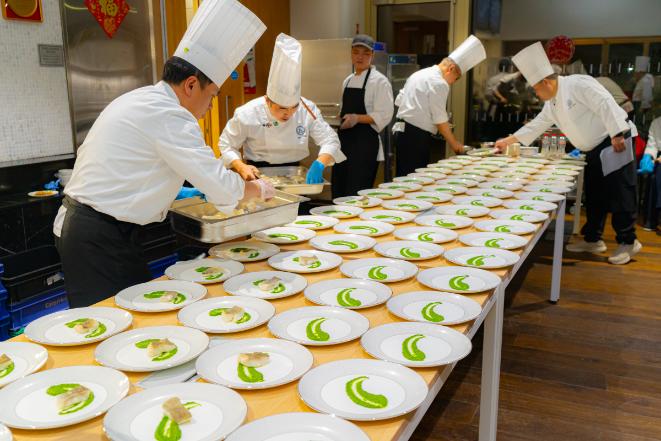 本次晚宴由黄山学院徽菜大师团队精心打造,通过将徽菜的传统技艺与爱尔兰优质本地食材相结合,为嘉宾呈现了一场中西融合的美食盛宴。整套菜单以山水入馔、以味传情”为灵感,巧妙融汇了黄山的自然神韵与徽州文化的匠心传承,充分展现徽菜“清淡中见真味”的烹饪哲学。