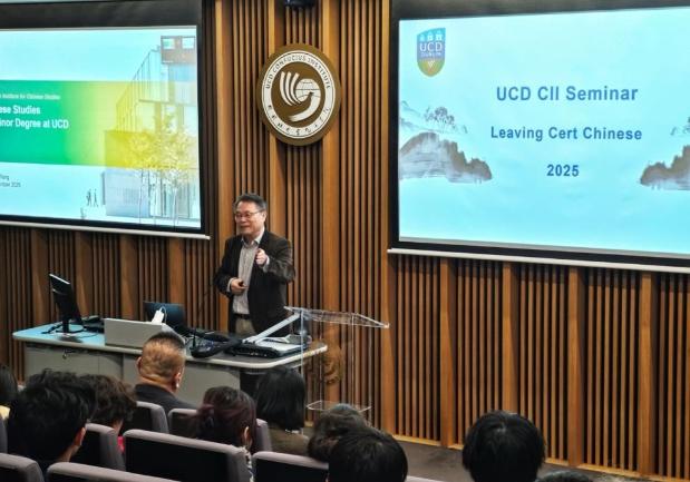 都柏林大学中国研究院院长王黎明教授在致辞中代表爱尔兰中国研究院向同学们介绍了中文相关的大学学位课程及辅修项目的情况,阐述了学习中文的必要性和独特价值,分析了当前中文学习的趋势与机遇,并鼓励同学们积极参与研究院的中文辅修课程,以拓展学术视野和提升语言能力。