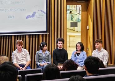 此次交流分享会特别邀请了五名高考班优秀毕业生代表参与,其中包括来自都柏林大学的 Brendan Pierse、Kieva Xie,以及来自圣三一学院的 Cillian Cusack、Fawn O'Neill Wang 和 Julian Lewandowski。五位嘉宾围绕中文高考备考经验、大学申请流程以及进入大学后的学习与生活体验等内容进行了深入分享,结合自身经历为在座学生提供了切实可行的参考与建议。