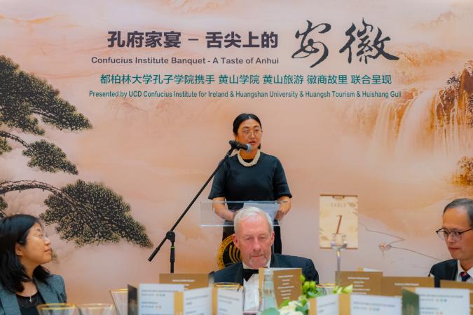 Ms. Yanling Wang, Director of the UCD Confucius Institute, subsequently delivered her remarks, extending heartfelt gratitude to University College Dublin and to the partners and guests who have long supported the Institute's development. She particularly thanked Huangshan University for sponsoring the event and the team of Huizhou cuisine chefs who traveled from China to present a culinary feast blending tradition with innovation. Ms. Wang also paid tribute to Professor Liming Wang, founding director of the Confucius Institute, whose vision and dedication has sustained the “Confucius Institute Banquet” series, establishing it as a premier platform for showcasing Chinese culinary culture and fostering Sino-Irish cultural exchange.
