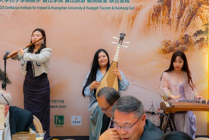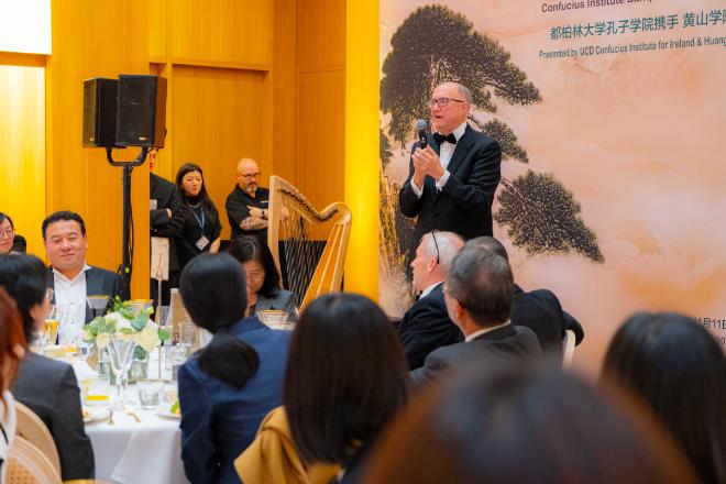 The event was hosted by Matthew Kelly, an alumnus of the UCD Confucius Institute. Guest speakers included Professor Dolores O’Riordan, Vice President for Global Engagement; Professor Jiang Hong, Vice President of Huangshan University; Ms. Yanling Wang, Director of the UCD Confucius Institute for Ireland; and H.E. Paul Kavanagh, former Irish Ambassador to China.