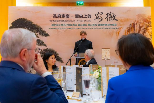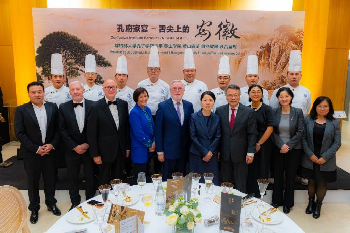 On the evening of November 11, 2025, the themed banquet “A Taste of Anhui” presented by the UCD Confucius Institute for Ireland, Huangshan University, Huangshan Tourism, and Huishang Guli (Homeland of Hui Merchants), concluded successfully at the UCD Confucius Institute. Distinguished guests from Irish political and social circles, representatives from the Chinese Embassy in Ireland, as well as members of academia, the media, and business communities attended the celebration. Sponsored by Huangshan University, the event featured renowned master chefs of Huizhou cuisine who traveled from China to craft a distinctive culinary feast showcasing the unique flavours and culinary traditions of Anhui Province for both Chinese and Irish guests.